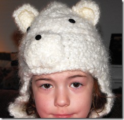 Since I made a cat hat for my oldest, my younger Carleton needed a hat too. Her choice was a polar bear. I was up for a challenge and looked up pictures on the internet for ideas. And I did it! No matter how hard I try I can not get a good picture of my daughter. She has the most beautiful eyes but whenever I take a picture she looks like she is heavily medicated or something. I have to take about 50 pictures to get one good one, so this was the best picture out of about 10.